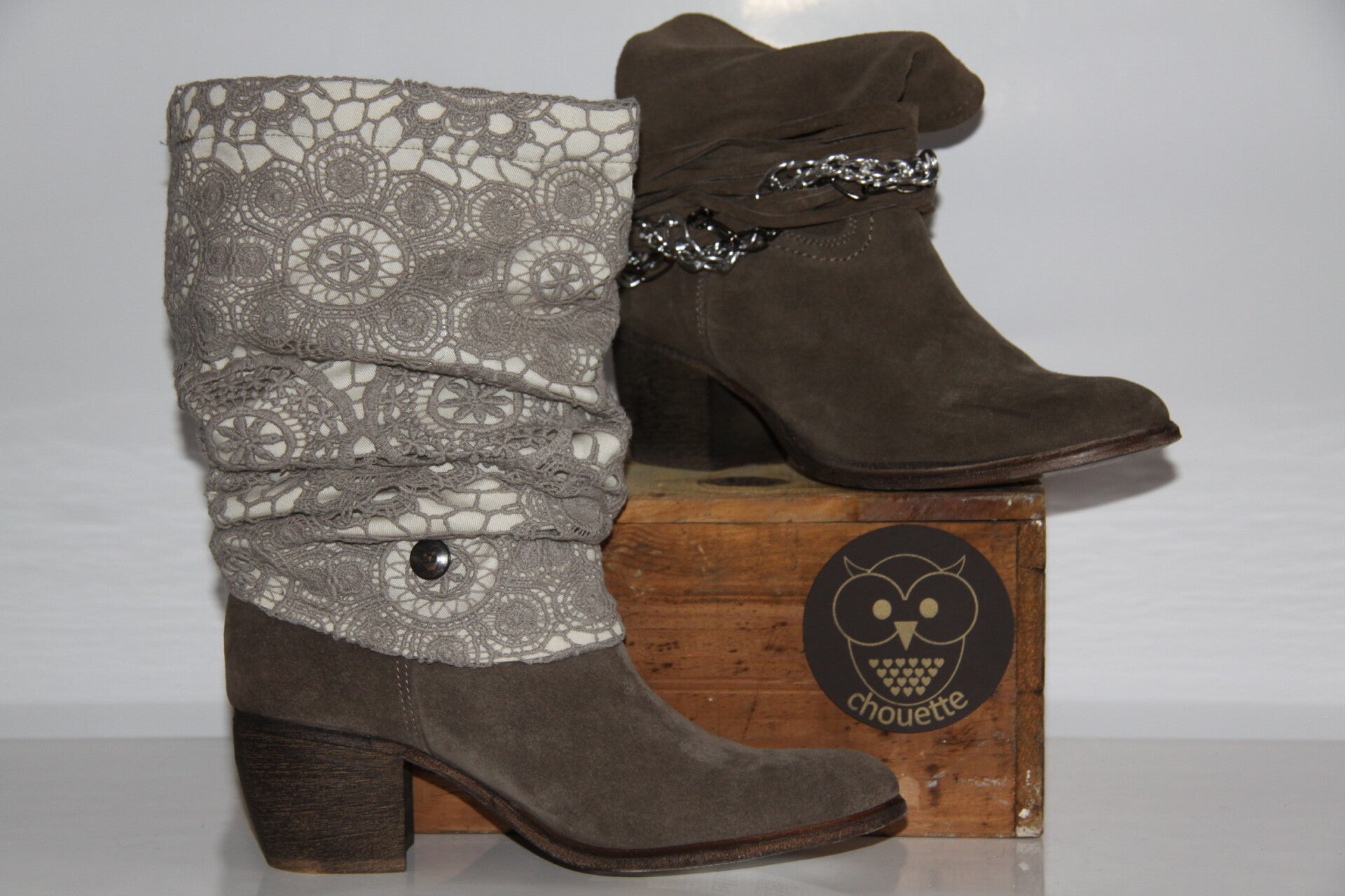 Botas em pele de camurça cor "Taupe" com perneiras em Renda